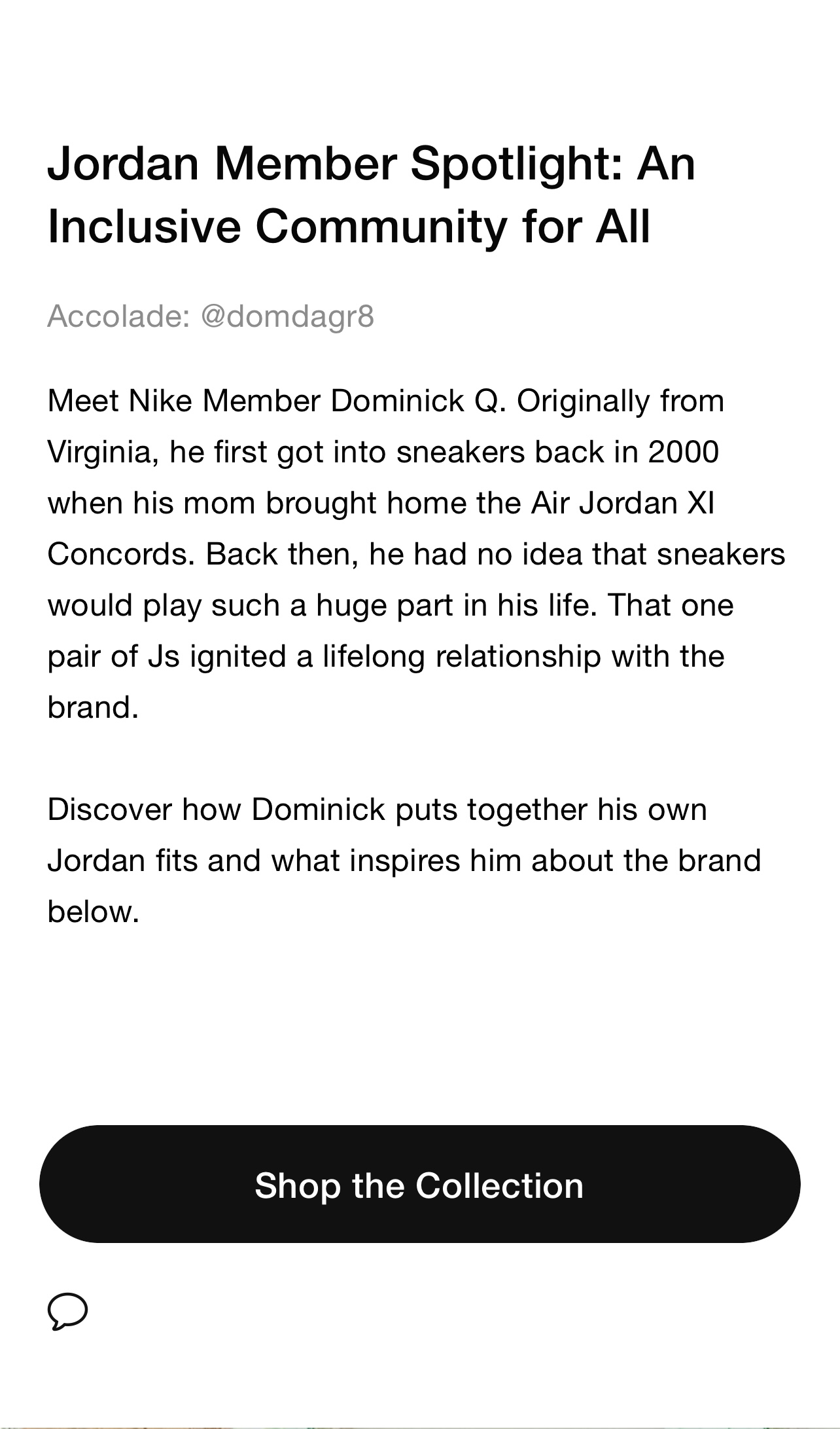 In June 2022, I was selected for a Jordan Members spotlight on the Dike app called Flight Fest. Flight Fest is an annual five day event where Jordan Brand highlights members of the sneaker community who are tastemakers in their respective areas. I was interviewed about my very first Jordan purchase and what the brand means to me. The feature was accompanied by a curated list of Jordan Brand products for users to shop.